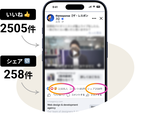 私たち「ザ・レスポンス」は、書籍やオンライン講座を販売するためのSNS広告を自社で出して運用しています。例えば、これは私たちが2025年6月に出稿した、本を売るための広告です。売り込みではなく、エンゲージメントを高める広告を作った結果、たった数ヶ月で、広告にも関わらず、「いいね」は2505件、「シェア」は258件されています。